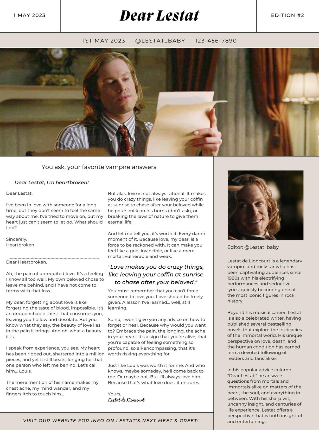 Legendary vampire Lestat de Lioncourt answers questions from mortals and immortals alike on matters of the heart, the soul, and everything in between.